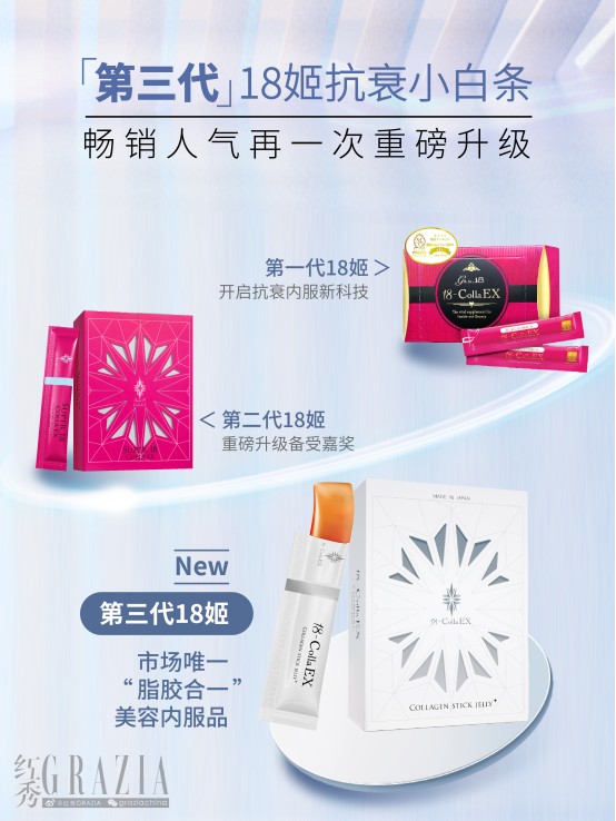 全新的第三代18姬是市场上唯一首款创造出 “脂胶合一”的美容内服品,这是一项难以实现的技术,COSMOAI研发部门通过不断地努力寻找这项技术上的突破,最终将脂质体VC与胶原蛋白肽结合成首款胶状物质的美容内服产品,带来一款可以喝的高浓度VC与面部填充剂。