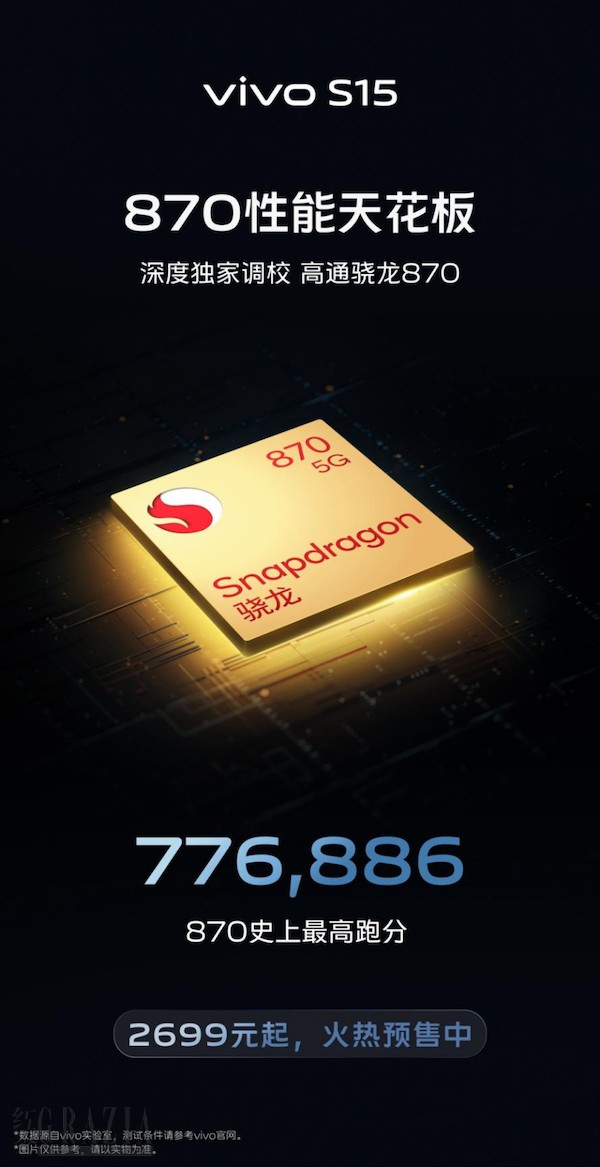 而在性能方面,vivo S15系列也得到了重磅升级,标准版S15搭载骁龙870,跑分超过77万分,创下了骁龙870史上最高跑分,刷新了性能“天花板”。vivo S15 Pro则搭载天玑8100旗舰芯和游戏独显芯片Pro,形成“混合动力”架构,配合80W双电芯闪充、电竞级仿生散热系统,在旗舰级性能基础上,带来媲美游戏手机的电竞级游戏体验。