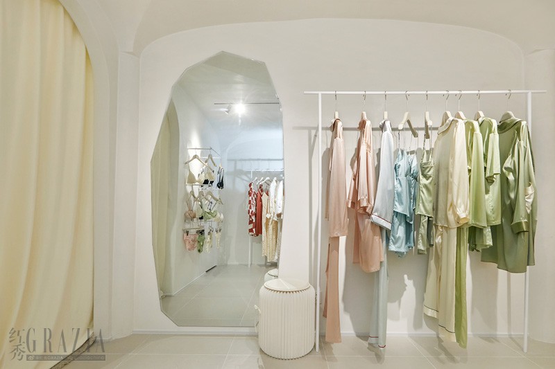 随着旋转楼梯上到更为安静私密的二楼,安福路的梧桐树影透过窗户洒进来,倒影在乳白色的墙壁上,时而沉默、时而跳跃,亦给空间增加了静谧与浪漫。在这里,Not Just Pajama为消费者提供更高端、限量的真丝产品,以及真丝内衣系列商品。同时,还提供“专属订制刺绣服务”。消费者们可以在这里为自己和亲友准备诚意十足的专属礼物。