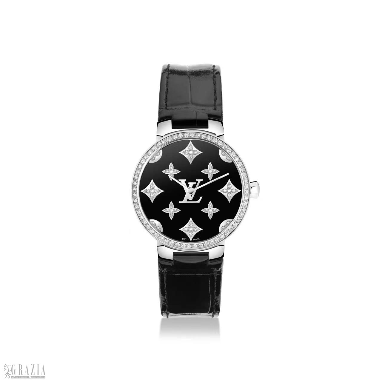 路易威登Tambour Slim系列腕表于2019年推出白色珍珠母贝表盘款式。今年,此款精致隽永的路易威登腕表以全新优雅姿态回归,同时致敬路易威登经典Monogram花朵图案。黑色漆艺表盘缀以明亮式切割钻石,银色花卉闪耀绽放。
