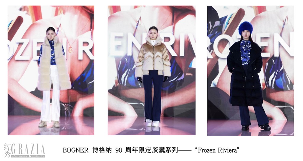 本次BOGNER博格纳90周年“越界新生”派对在感官上制造最潮体验,通过沉浸式空间和时装秀双重展示 BOGNER博格纳90周年限定胶囊系列“Frozen Riviera”、“BOGNER 007”联名限定胶囊系列以及BOGNER 博格纳2022秋冬滑雪系列的最新作品。各系列主题空间从新品中提取设计灵感,将装置艺术、时尚、科技、运动等元素联结,多围度展示品牌系列的丰富性和时尚度,彷佛将来宾带至阿尔卑斯山间,开启奢华冰雪之旅。