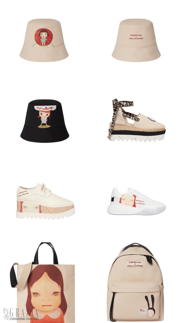 整个系列采用中性色系,彰显新一代所推崇的环保意识下的时尚理念,包括有机棉弹力针织T恤、羊毛帽衫和慢跑裤等,受奈良美智的激进主义、态度和艺术的启发,设计中饰以其插画作品中若有所思的女孩形象、打扮成动物的儿童,锐利的眼睛以及“STOP THE BOMBS”(停止使用炸弹)等适时的反战口号。这一设计还将延续使用植物性成分的府绸衬衫和短裤、经典水洗阔腿牛仔裤、渐变柔粉色的丝滑日常睡衣套装,更有搭配纯素非皮革Alter Mat面料衣袖的几何风格双面飞行员夹克。于圆领套头衫、罗纹有机棉高翻领毛衣和大理石纹灰色外套等针织单品上,饰有诙谐的绵羊、兔子和其他动物插图。