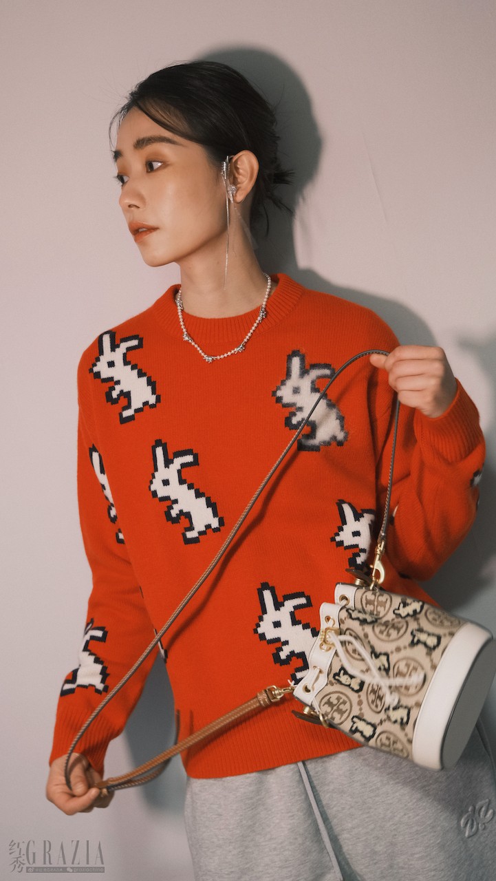 刘雅瑟演绎Tory Burch Lucky Rabbit胶囊系列兔子图纹羊绒毛衣,搭配T Monogram迷你刺绣水桶包