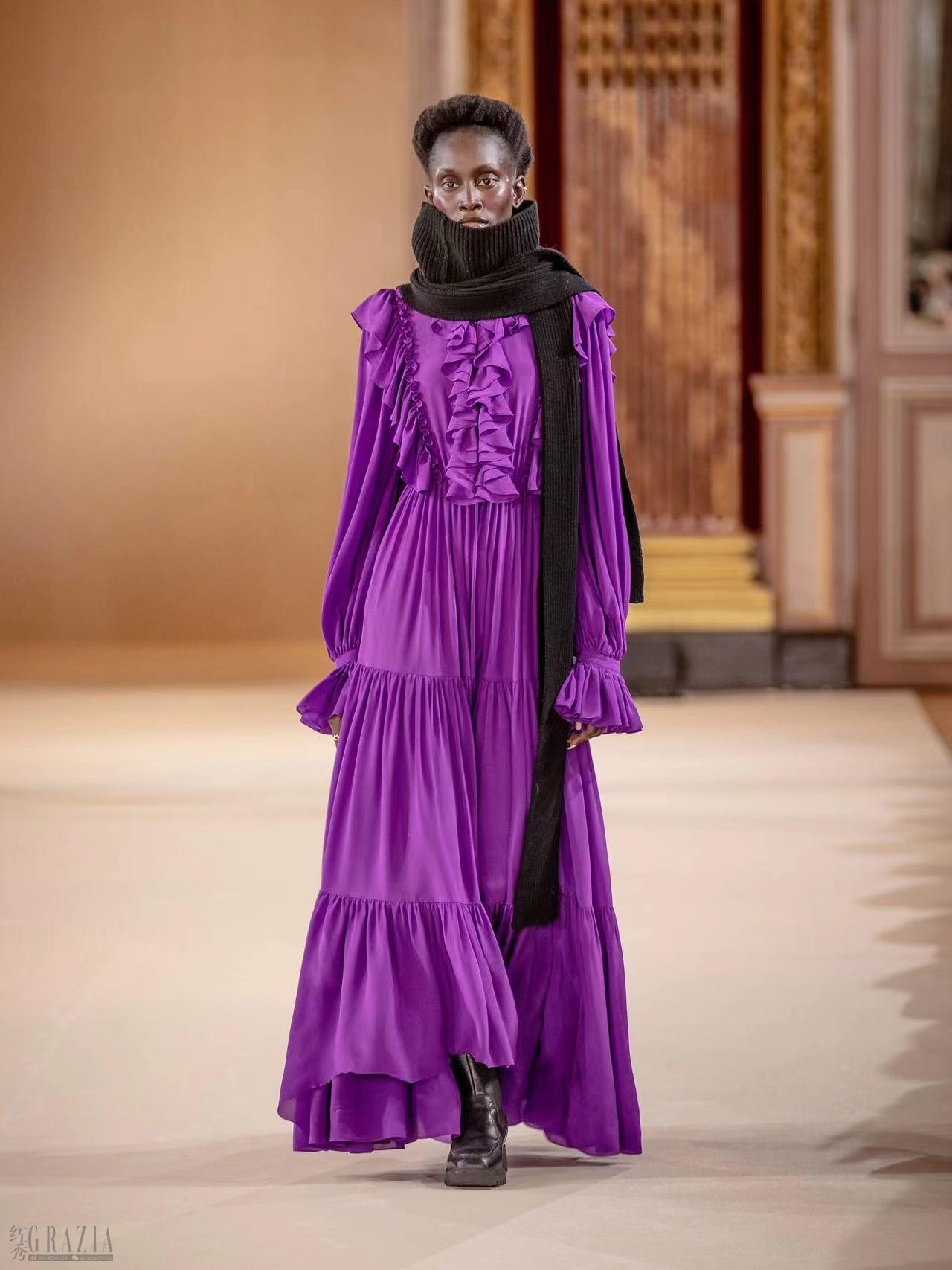 秀场最后呈现出⼏个浓郁⾊彩的造型,同样纯粹的紫与粉,是⼥⼈的两⾯性,新时代⼥性的魅⼒是多元、多样的,仿佛将性感⼒量的紫和柔软细腻的粉设于⼤秀结尾,期待观众能被刚柔并济、硬朗与柔美相结合的元素吸引,重审⼥⼈天⽣坚强与柔美并存的灵魂。