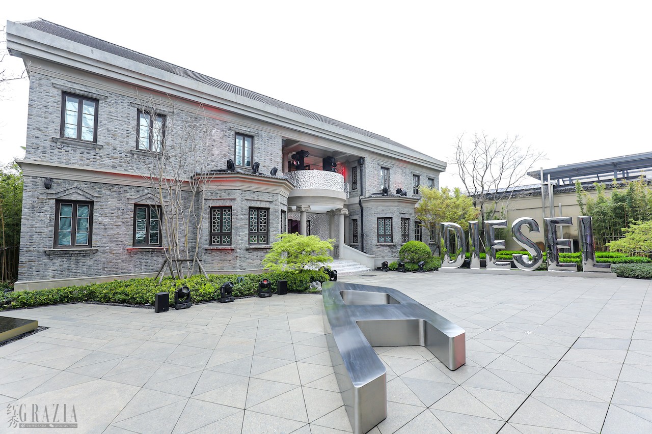 迈入故居花园,即刻进入一个未来感金属世界。DIESEL与标志性D LOGO银色镜面装置坐落于花园入口,强调品牌基因。全银锡纸包裹的墙面构建大胆、玩味的夺目肌理空间,为建筑注入潮流前卫的Y2K风格。