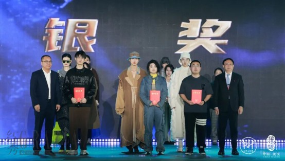 ·鄂尔多斯羊绒集团设计总监蔺奇伟、“金顶奖”设计师张义超为获得最佳概念设计奖的作品《徙步沙丘》和获得最具商业价值奖的作品《影》颁奖