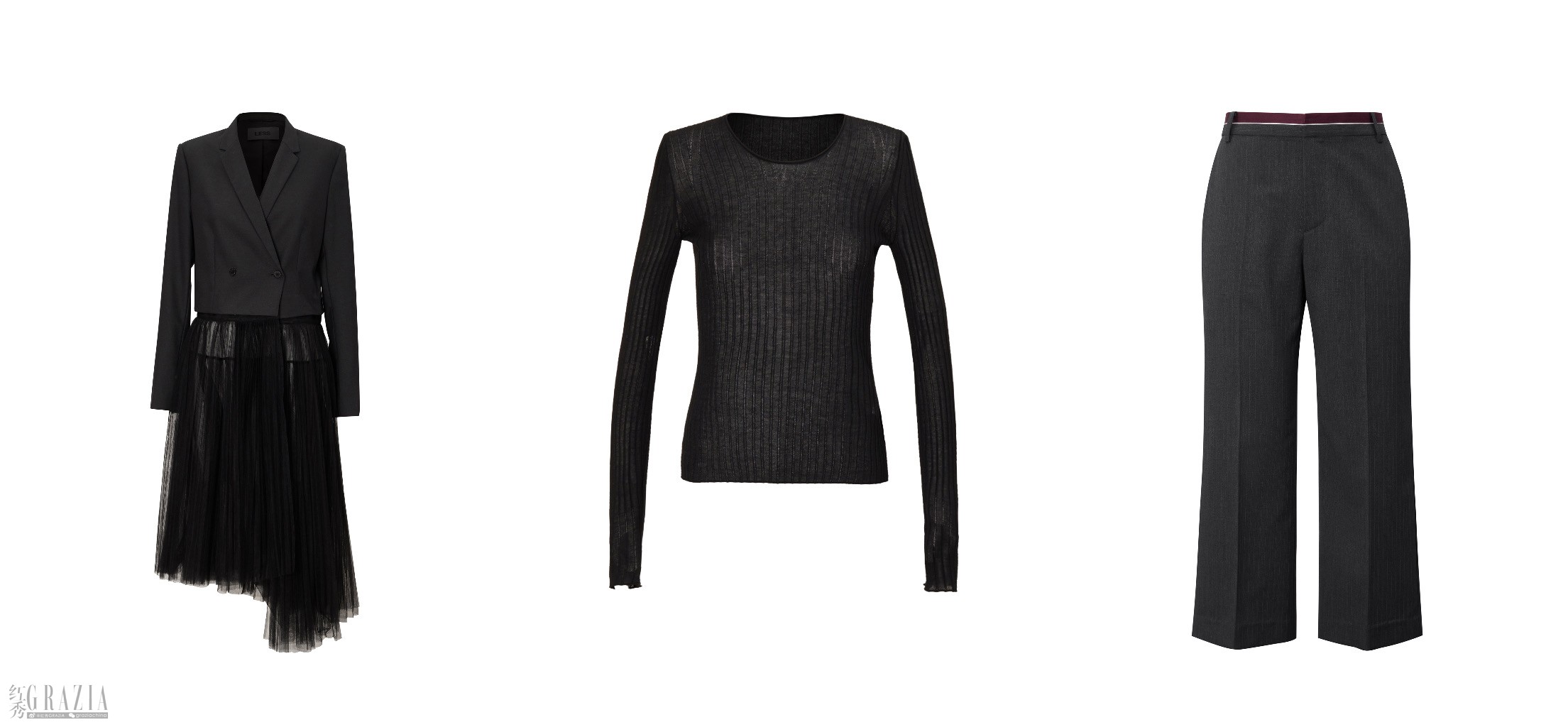 精工纱裙西装,可拆解网纱裙摆组合式西服,设计新颖有趣;内搭轻薄棉纱毛衫,为春寒料峭时节保暖又不失春日气息。