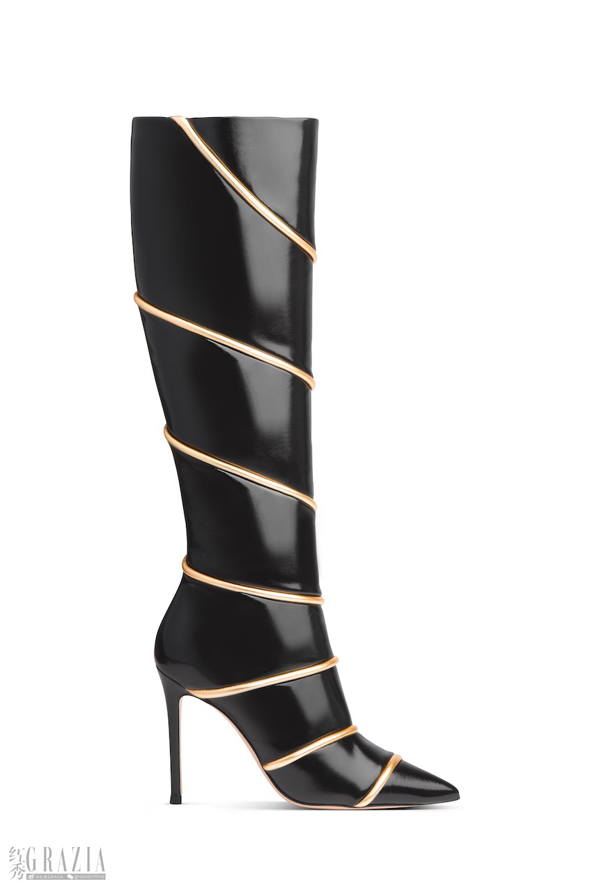 随即呈现性感风格单品:金色立体滚边装饰盘绕于及膝细高靴表面,极具反差美感。尖头细高跟凉鞋,由深红色亮面皮革打造,同样缀以螺旋形不对称装饰,大胆而迷人。