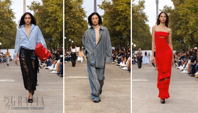 长款流苏磨边针织连衣裙以黑、白、红三色呈现,尽显经典之美。蕾丝镂空长裙与丝绸连体衣则汲取了复古内衣的独特魅力。有机棉牛仔衬衫和护腿裤则以熠熠生辉的无铅水晶满铺。