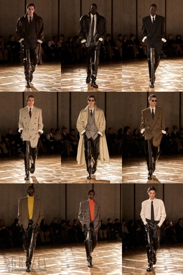同时,对立的主调——在阴郁与明亮、柔软与坚硬、宽大与纤细之间的对比——也贯穿秀场置景设计。本季男装秀场重返巴黎商品交易所-皮诺艺术收藏馆(Bourse de Commerce),空间内极简的线条及冷硬墙面,与历史感厚重的华丽镶木地板并置,后者让人唤起对昔日奢华沙龙的回忆。秀场的巨大吊灯装饰也是对品牌曾在1975年至2001年间在巴黎洲际酒店(Intercontinental Hotel)宴会厅发布其高级定制系列的致敬。