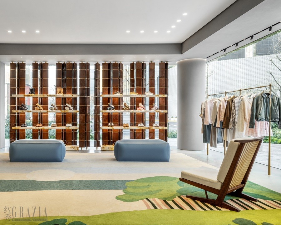 上海罗意威之家为静安嘉里中心特别呈现一系列品牌家居艺术收藏,从西班牙古董陶瓷器皿 到现代设计作品。Gerrit Thomas Rietveld棱角分明的乌得勒支扶手椅,与Oliver Gustav 的 亚麻布沙发、定制毛毡Berin俱乐部椅,以及数件中岛乔治的Mira高脚椅和深棕色胡桃木 Conoid软垫椅相得益彰。比利时设计师Axel Vervoordt的宁静的漂浮石桌与LOEWE罗意威 的黑焦木台座和黑色水磨石桌面相映成趣。其他LOEWE罗意威标志性作品包括黑铁马天尼 桌和一张展现品牌精湛皮革工艺的绗缝蓬松长凳。天花板悬挂着野口勇的精致和纸Akari E 吊灯,六张西班牙定制羊毛手工地毯静谧覆于精品店地面之上,其图案重现了英国纺织艺术家 John Allen明 媚 田 园 风 格 的 挂 毯 作 品,包 括《奥克尼夕景》、《白粉笔勾绘的巨人》和《罗斯利 的植物丛》。