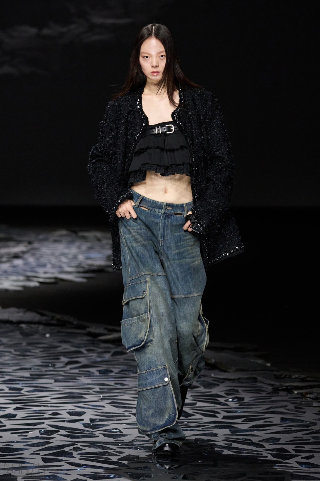 该系列大胆采用代表过去与自然的牛仔和象征未来与科技的金属辅料这两种截然不同的材质,在牛仔服饰中大面积加入金属哑铃、镜面烫钻、金属扣件等材质,创造出强烈的视觉冲击力。这种设计传递出“Y3K”美学对人性化、功能性和情感表达的重视,让本季作品既实现了对未来时尚的大胆探索,又对过去经典表达了诚挚致敬,将Y3K美学中“未来与复古碰撞”的特色进行了完美呈现。