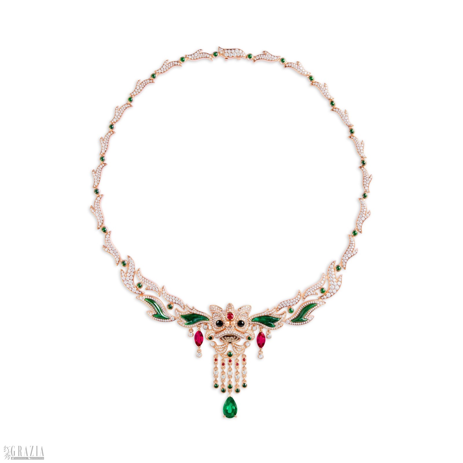Qeelin Xi Xi 高级珠宝系列 18K玫瑰金祖母绿、红宝石、翡翠及钻石项链、耳环