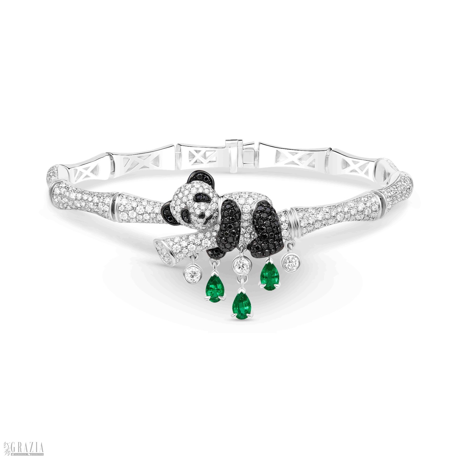 Bamboo Bo Bo作品将Qeelin经典熊猫形象与竹子结合,展现其与自然栖息地的亲密关系。作品以18K白金、钻石与祖母绿,通过密镶与衔接技术打造灵动竹节,尽显Bo Bo嬉戏竹间的自然野趣。