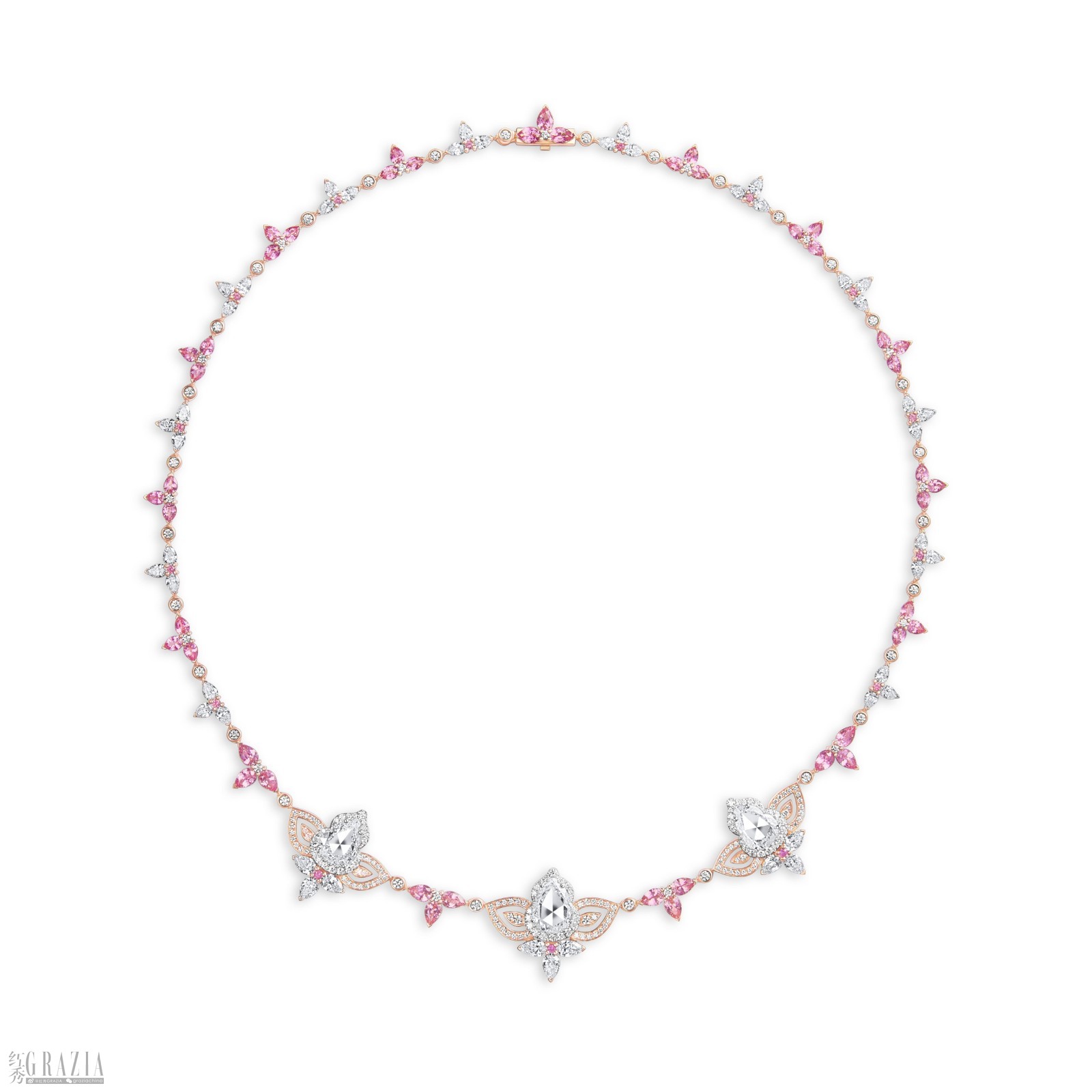 Wulu Diamond Lotus 高级珠宝系列重塑“出淤泥而不染”的莲花意象,以18K白金与玫瑰金镶嵌钻石及粉红蓝宝石,如水墨晕染般散发出华丽女性气息。系列最大亮点是品牌耗时十年独创的葫芦形钻石切割工艺,使花瓣呈现颤动的微光,巧妙勾勒颈部线条,并与自然美学完美相融。