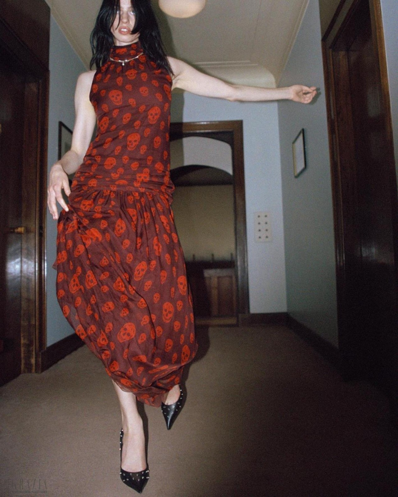 牛血红与焰红色McQueen骷髅头印花真丝雪纺挂颈上衣以骷髅头刺绣点缀。
