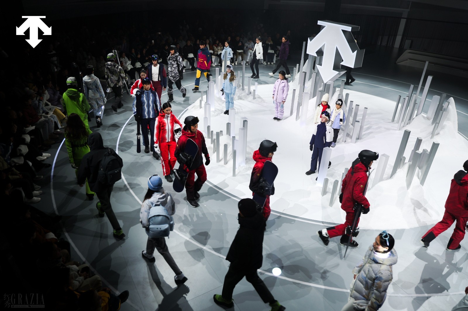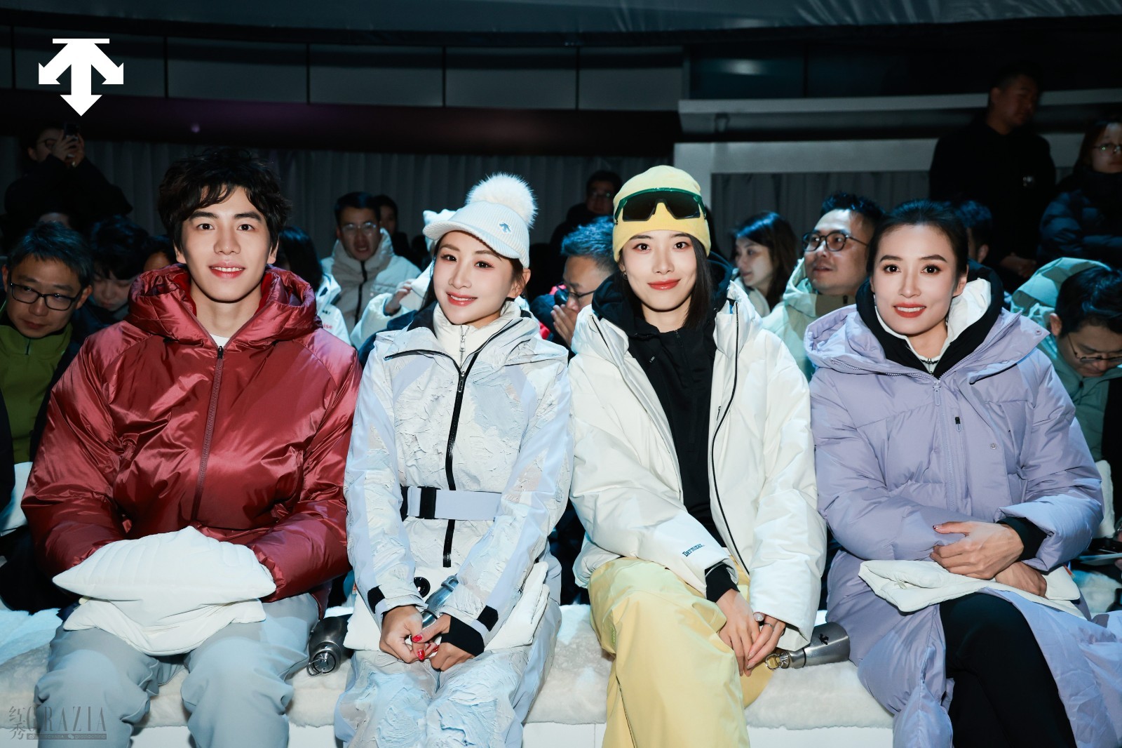 大秀走秀环节接续上演,以科技为翼勾勒全景运动图景,四大核心装备系列依次亮相。从彰显专业巅峰的国家队系列、贴合滑雪运动核心需求并融入匠心的单双板场上和场下装备,到融合非遗文化的香云纱系列、凝练匠心与机能美学的 ALLTERRAIN 系列,再到与艺术家 Daniel Arsham 联手打造的联名系列,全面覆盖专业运动与都市生活多元场景。期间,迪桑特签约运动员周苡竹领衔一众儿童模特身着儿童滑雪系列惊喜登场,萌趣中尽显冰雪运动的新生代活力。他们牵引迪桑特品牌代言人步入秀道,将“未来力量”与“专业领航者”在同一时刻连接,共同完成大秀高潮的递进。当三位代言人来到舞台中央,全场灯光随之开启最终章节的点亮,30套走秀造型悉数回归,构成整场大秀最具视觉张力的全景画面。它们集中展现各系列在性能突破、结构创新与机能美学上的核心优势,完整勾勒出迪桑特凭借多元产品实力,向“问顶未来”稳步迈进的进阶之路。