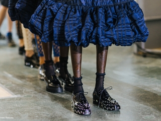 鞋履设计均在绅士鞋原型之上展开对性别符码的探索,以系带牛津鞋和乐福鞋为基底,并全部采用抛光黑色小牛皮革制作,再经由两个品牌的独特视角重新诠释。STAR 鞋款以极致经典的尖头牛津鞋为原型,镶有朋克风格的五角钢星。这颗星既是 Jimmy Choo 的标志性元素,也是 noir kei ninomiya 2026 春夏系列中贯穿始终的服装设计结构图案,在此则化作鞋头与沿条皮革鞋底上的璀璨点缀。而鞋身铺满星芒铆钉点缀的STAR鞋款将在部分精选旗舰店独家发售。MAXI LOAFER鞋款将传统男士乐福鞋的鞍形带、莫卡辛缝线鞋头及突出的鞋底结构,与 Jimmy Choo 标志性的精巧滴跟融为一体,在一件单品中同时展现脆弱与力量。压轴亮相的CRYSTAL鞋款则将前两款鞋型的特点融合,男士牛津鞋的鞋跟以透明树脂进行透视重构,其中包裹并展示着镶满细密水晶的经典水滴跟,珍贵细节在透明方跟中若隐若现。水晶仿佛从中漫溢而出,点缀着锋利的皮革鞋后帮,形成细腻与力量的二元交融。同时乐福鞋的轮廓亦经重新设计并抬高,以容纳这一独特鞋跟,再次实现对立元素的融合。