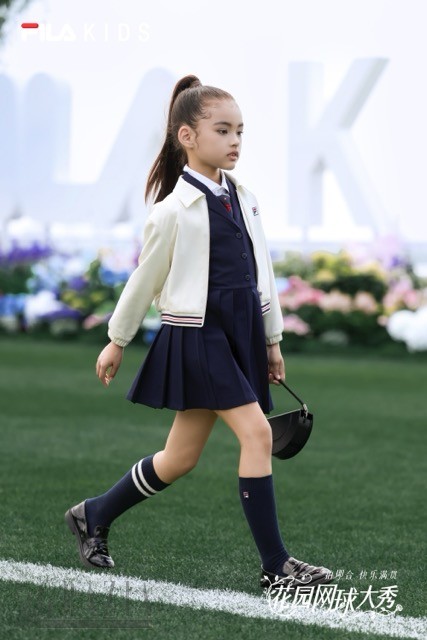 第三篇章“花园派对”,角逐落幕,画风转入赛后的惬意社交时刻。模特们身着承袭品牌发源地纯正基因的 Biella 系列及传承 FILA 经典优雅风格的华服惊艳亮相,精准演绎了属于儿童的高阶“花园老钱风”,展现了网球运动从专业竞技向社交生活延伸的无限可能。