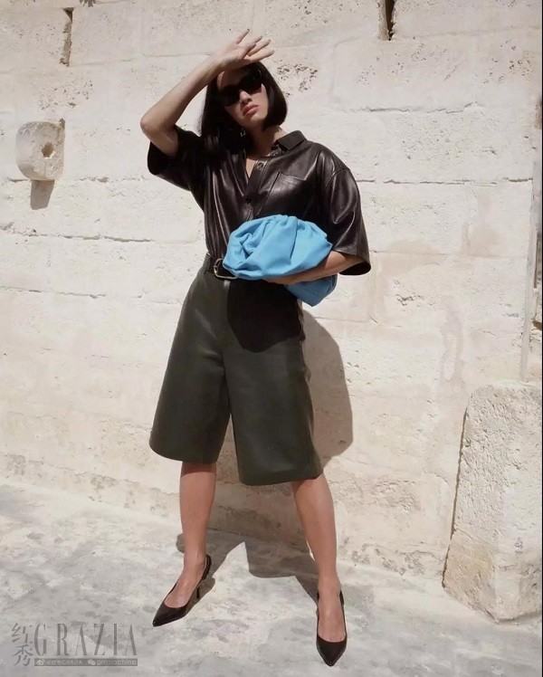 初秋的到来,你可以选择皮质的短袖搭配皮质百慕大裤,再像时尚买手Tiffany Hsu一样,用蓝色的The Pouch给初秋增添点颜色。