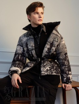 灰色自然印花羽绒外套以黑白调森林雪景印花为核心设计,将自然意境化为可穿戴的艺术。简约短款廓形设计、可拆卸拉链帽与罗纹收口袖等细节,在体现产品的艺术风格表达的同时,也让穿着体验更加便捷、温暖。