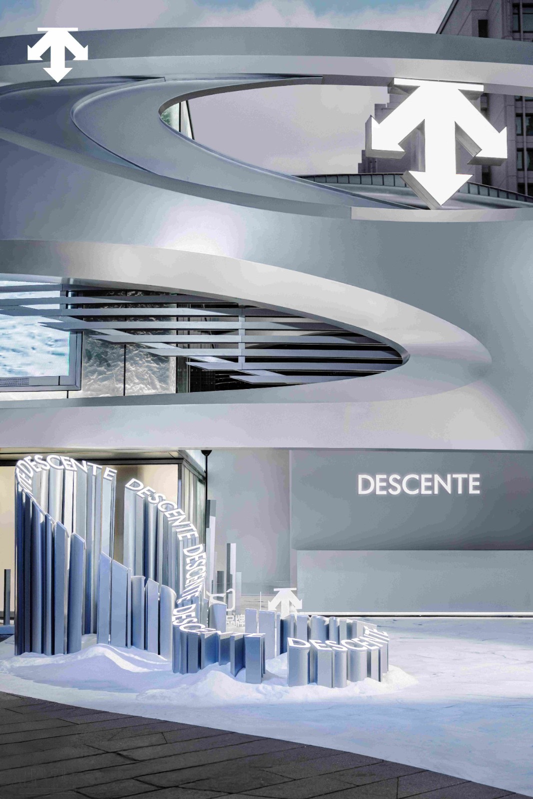 本次“问顶未来”品牌大秀以迪桑特北京华贸全球旗舰店——“未来之城”为叙事起点,让建筑本身成为大秀的核心叙事载体。“未来之城”的设计核心源自无限向前的概念——莫比乌斯环,空间以此为母体,结合品牌基因化作无限延展的雪道,营造出周行不息的视觉体验。大秀外场以“未来雪域”为灵感,围绕滑手破雪的雪浪意象,打造出冰晶光束与金属结构交织的光影装置。这一装置与建筑立面的莫比乌斯环相呼应,科技感与冰雪意象交融,既构筑起通往未来运动世界的第一视觉印象,也让嘉宾未入内场便沉浸于品牌营造的未来语境中。